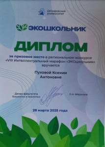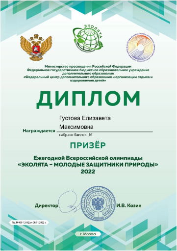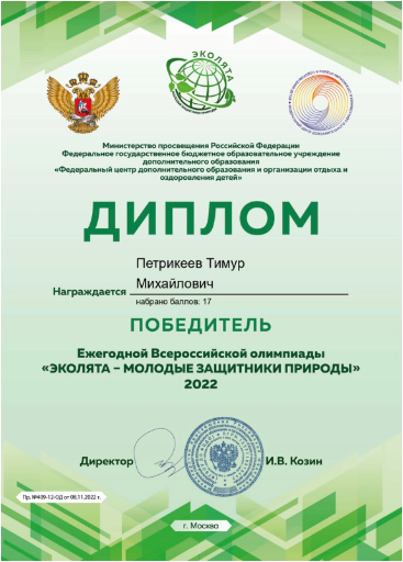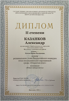 В ноябре состоялся региональный этап Всероссийского конкурса юных исследователей окружающей среды " Открытия юных – 2030". В номинации "Юные натуралисты " принял участие обучающийся объединения "Эрудит" (рук. Попова И. В.) Казанков Александр. Исследовательская работа Александра была отмечена дипломом 2 степени.