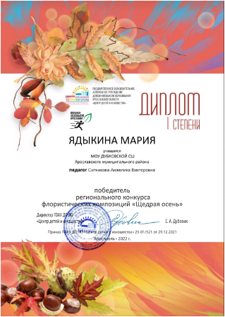 Ядыкина Мария представляла нашу школу в региональном онлайн конкурсе "Щедрая осень". Итогом её творческой работы стала высокая оценка экспертного совета конкурса. Мы поздравляем Марию с Дипломом 1 степени!