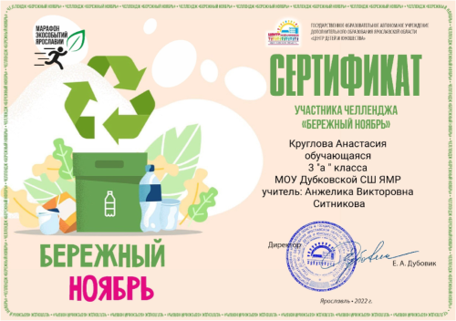Бережный ноябрь объединил ребят под руководством А. В. Ситниковой под девизом "За сохранение планеты". Весь месяц обучающаяся Круглова Анастасия успешно проходила задания челленджера: рассчитывали количество мусора и распределяла его по категориям, продумывала варианты замены одноразовой упаковки, изучала интересные научные факты. Анастасия с достоинством прошла все этапы "Бережного ноября" и была отмечена свидетельством участника.