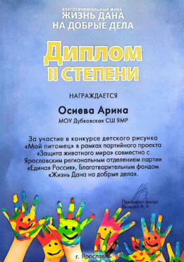Конкурс рисунков, посвящённых бездомным животным и домашним питомцам был организован благотворительным фондом "Жизнь дана на добрые дела" при поддержке партии Единая Россия. Обучающиеся нашей школы приняли активное участие в этом мероприятии. Участие ребят было результативным.